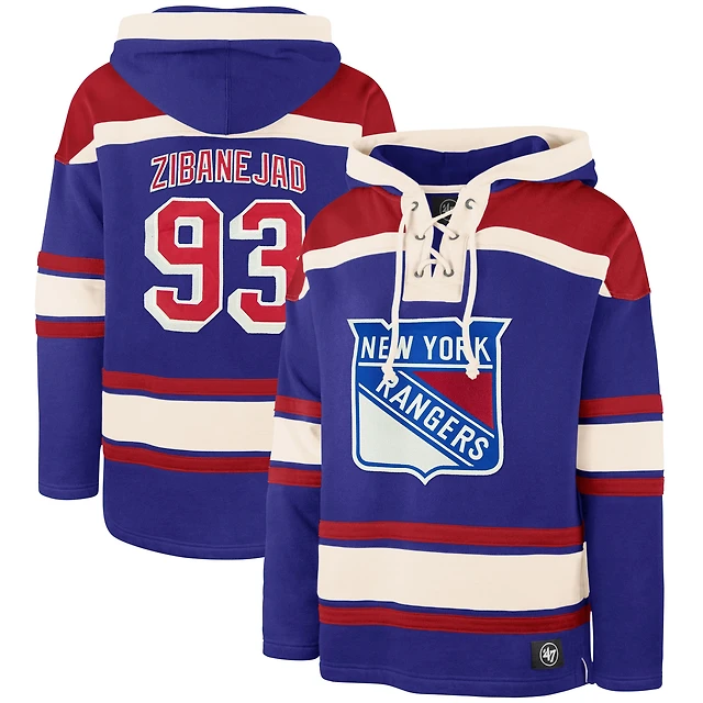 Men's '47 Mika Zibanejad Blue New York Rangers Player Name & Number Lacer Pullover Hoodie