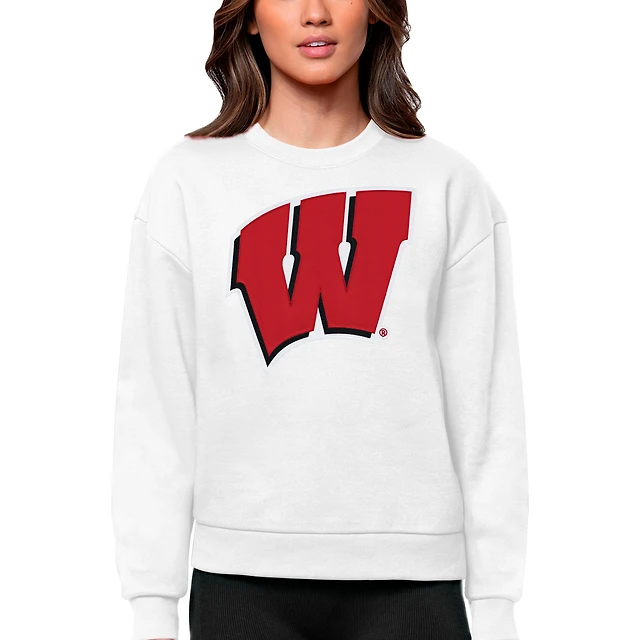 Women's Antigua White Wisconsin Badgers Victory Crewneck Pullover Sweatshirt