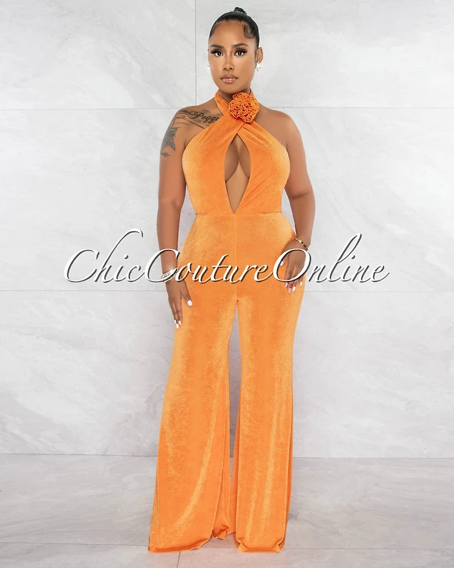 *Lorraine Orange Bust Key-Hole Rose Accent Jumpsuit