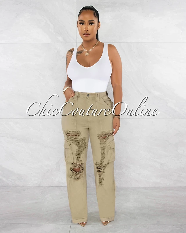 *Reiko Olive Green Cargo Mom Distressed Jeans