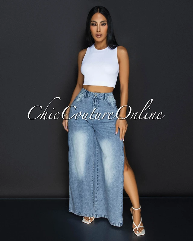 Zini Medium Denim Open Zip Wide Legs Jeans
