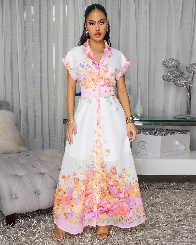 Zaria Off-White Multi-Color Floral Print Belted Maxi Dress