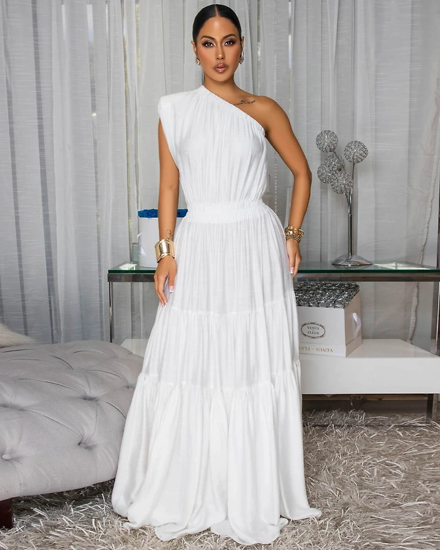 Belkys Off-White Single Shoulder Tiered Maxi Dress