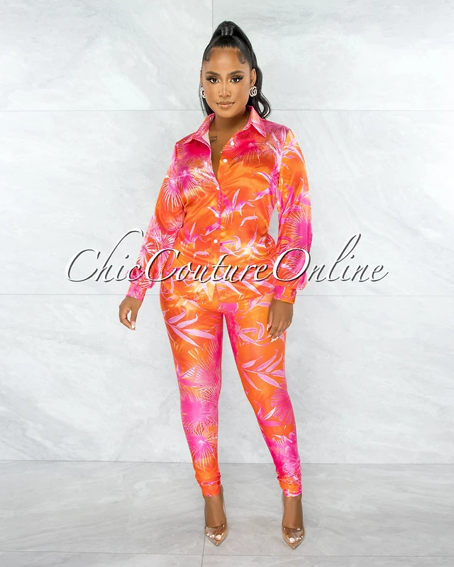 Dabney Orange Palm Print Satin Shirt & Leggings Set