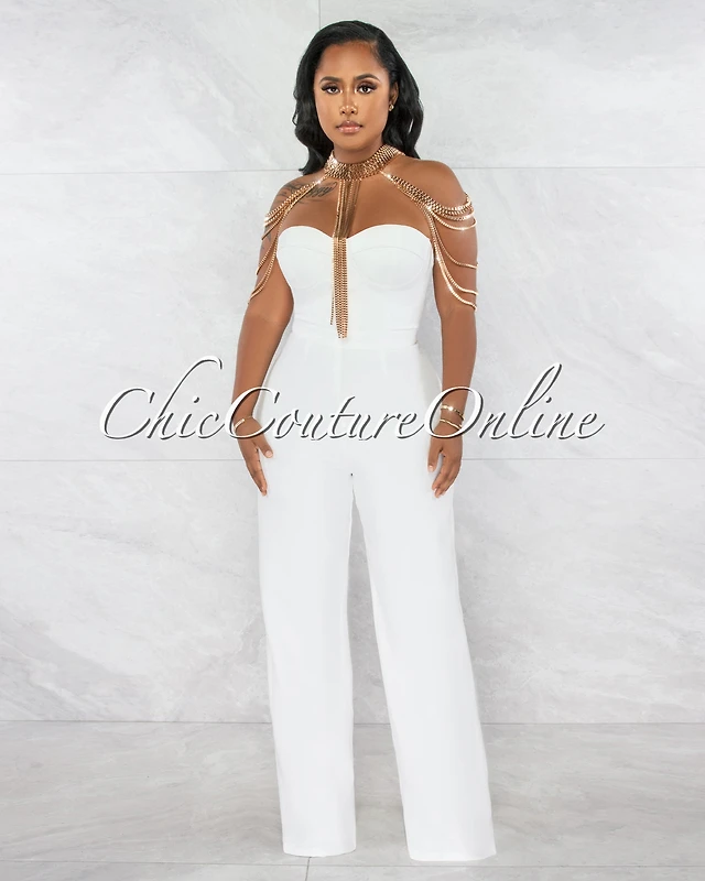 *Gladwin Off-White Gold Collar Accent Strapless Jumpsuit