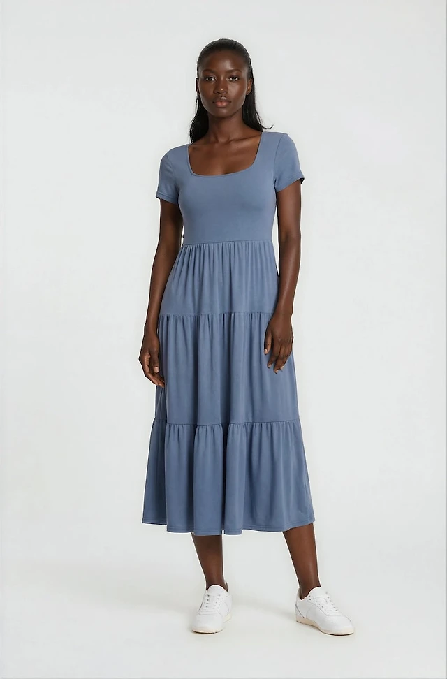 Polka Dot Tiered Sheer Sleeve Midi Dress - Navy