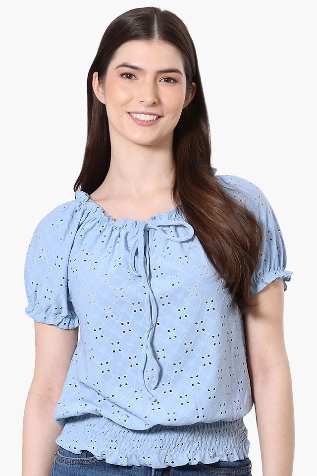 Urbanology Eyelet Drawstring Neck Blouse - Blue
