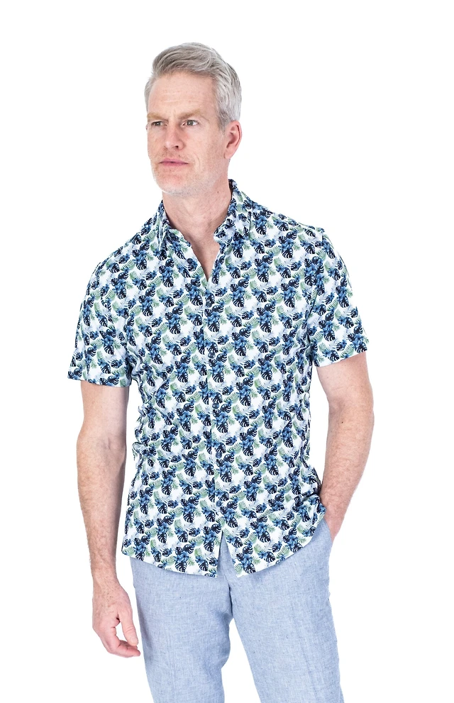 Short-Sleeve Cotton/Stretch Leaf Print Sport Shirt - Green / Blue