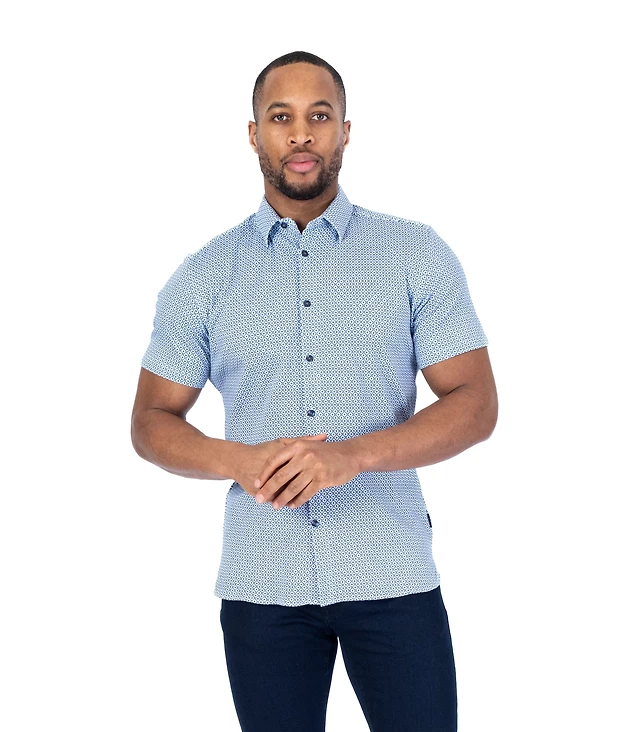 Short-Sleeve Cotton/Stretch Mini Floral Sport Shirt - Blue / White