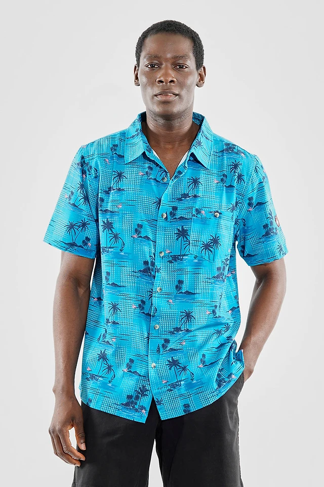 Canada Weather Gear Travel Collection Tropical Print Button Up Casual Shirt - Blue