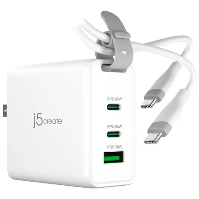 j5create Slim 65W 2-Port USB-C Wall Charger with Power Delivery (JUP2465) - White