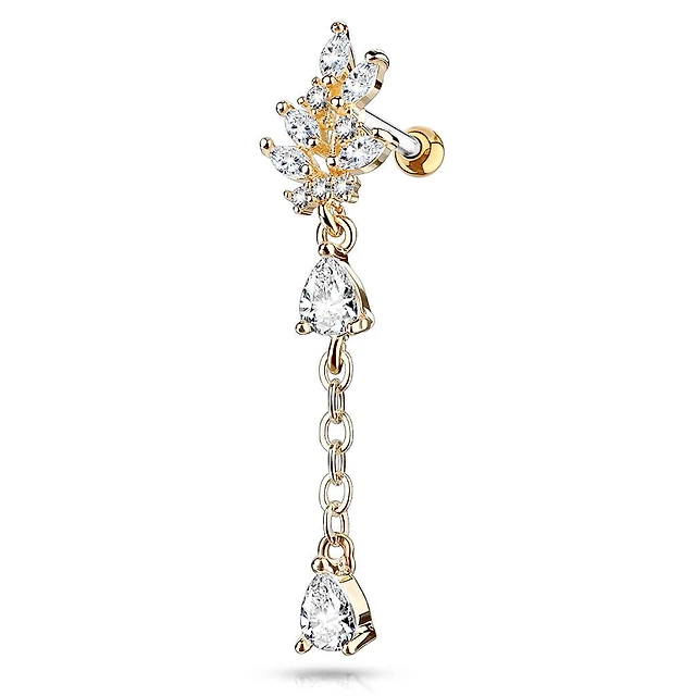 Gold Plated Surgical Steel White CZ Leaf Dangling Teardrop Cartilage Ring