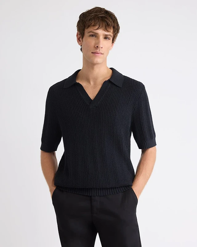 Short-Sleeve Half-Zip Textured Sweater with Shirt Neckline