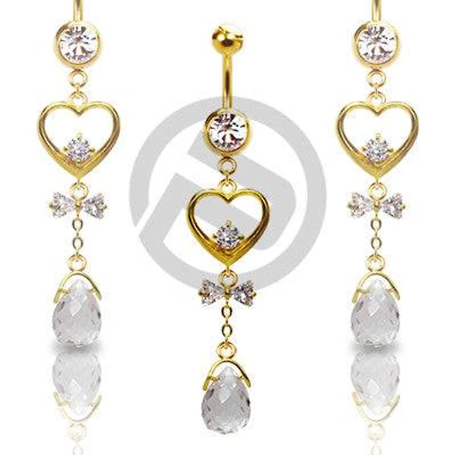 Gold Plated Clear CZ Heart and Bow Dangle Belly Button Navel Ring