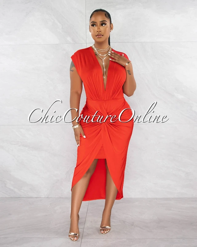 *Chantal Red Deep V-Neck Fron Knot Dress