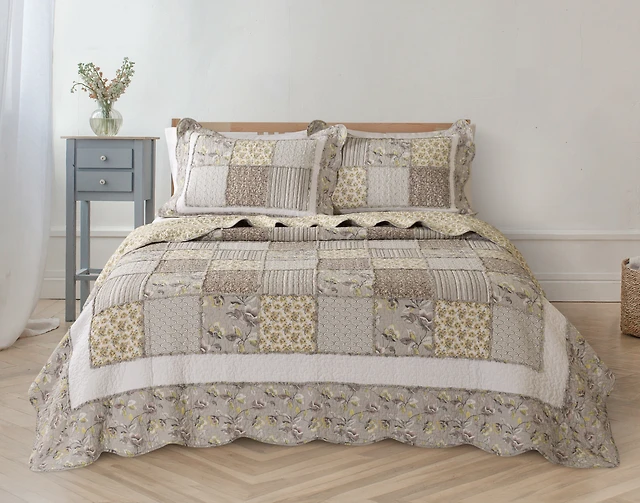 Annalise Cotton Quilt Set, Botanical, Grey,
