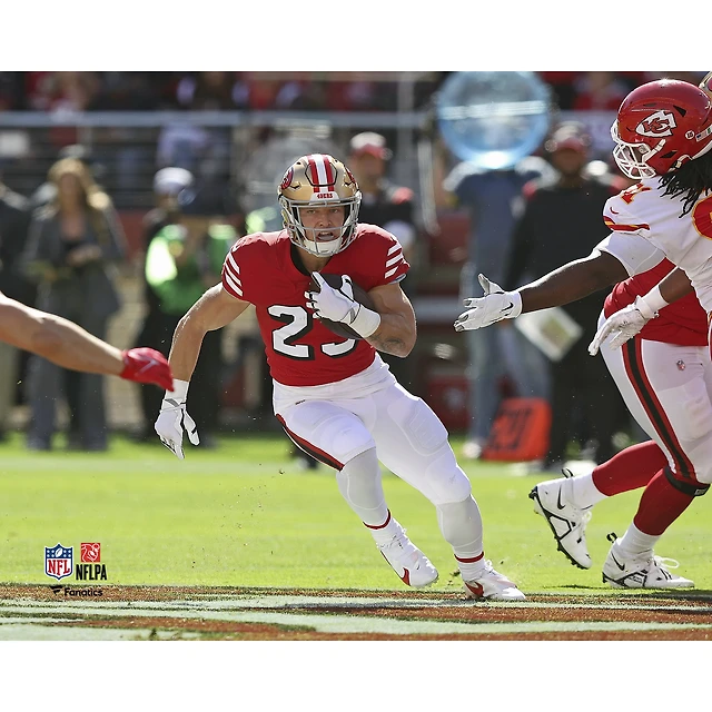 Christian McCaffrey San Francisco 49ers Unsigned Runs the Ball Scarlet Jersey Photograph