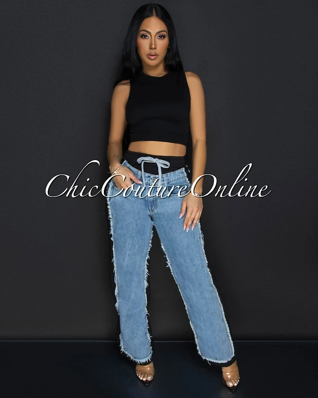 Allie Black Blue Denim Sporty Wide Legs Pants