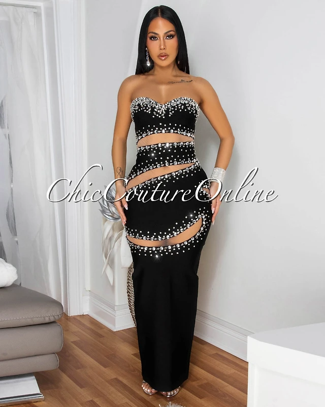 Regala Black Rhinestones Cut-Out Strapless Maxi Dress