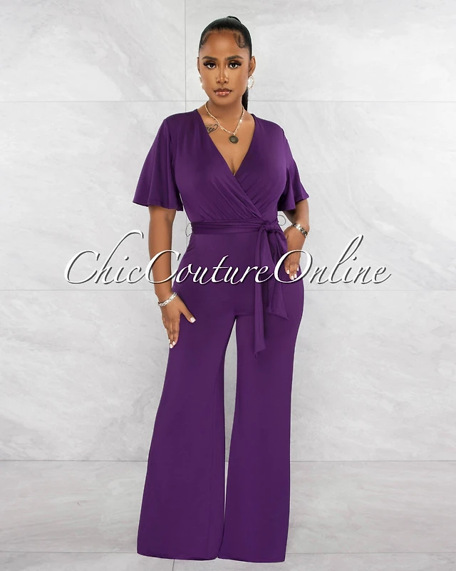 *Reilly Purple V-Neck Self-Tie Belt Jumpsuit