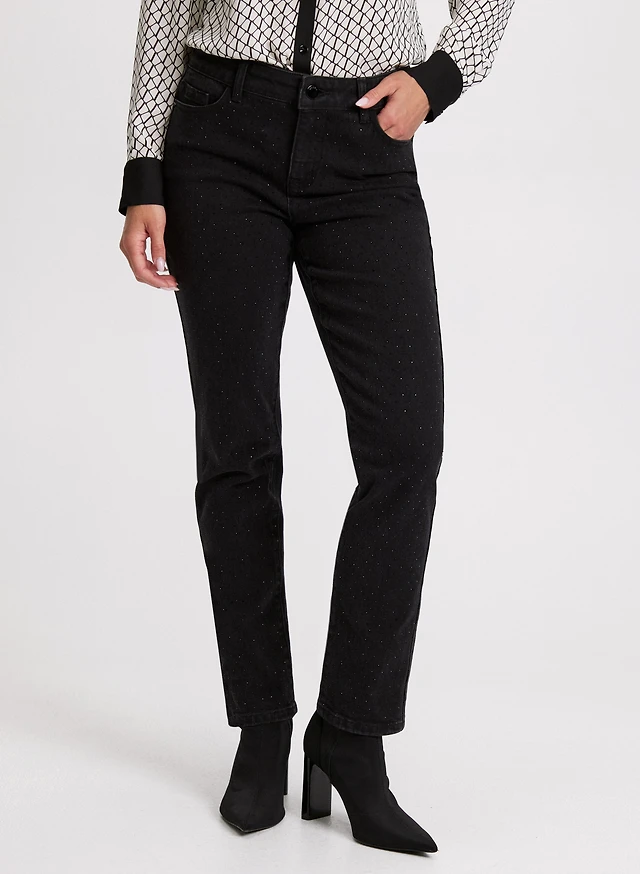 Ruffle Trim Blouse & Rhinestone Detail Straight Leg Jeans