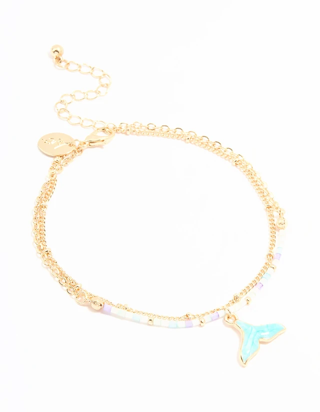 Gold Beaded Whale Tail & Fine Chain Layered Anklet