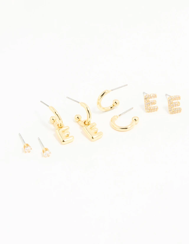 Gold Plated Cubic Zirconia Letter E Stud & Hoop Earrings 4-Pack