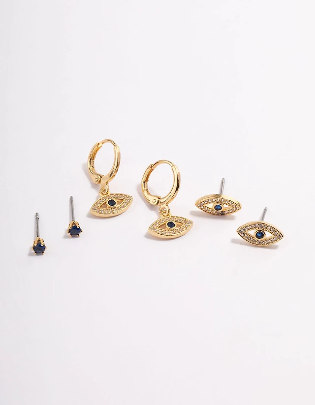 Gold Plated Cubic Zirconia Evil Eye Earrings 3-Pack