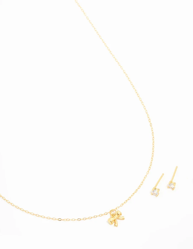 Gold Plated Brass Bow Drop & Cubic Zirconia Huggie & Stud Earrings 3-Pack