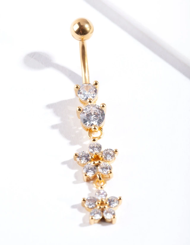 Gold Surgical Steel Cubic Zirconia Flower Belly Ring