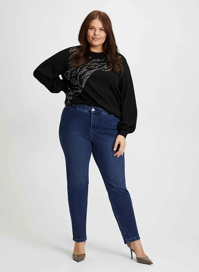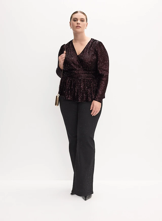Crossover Sequin Top & Studded Flare-Leg Jeans