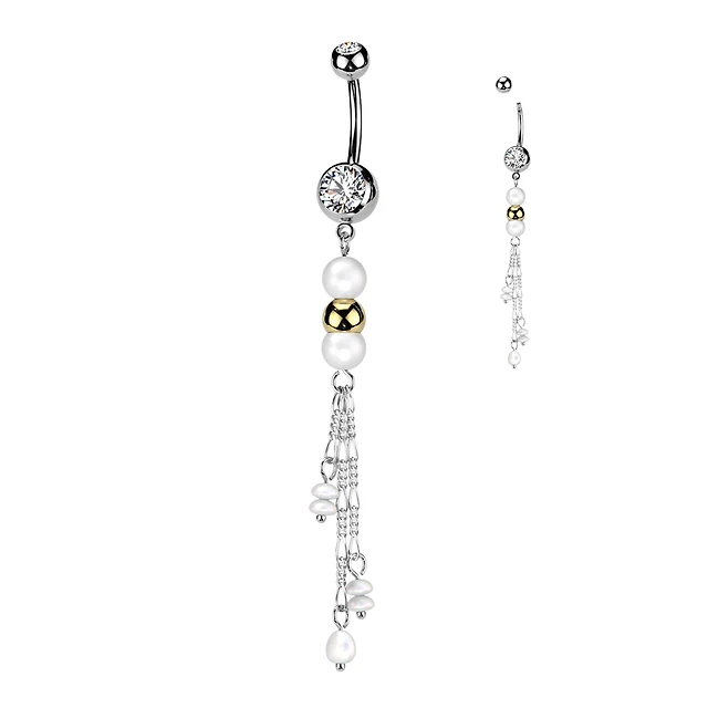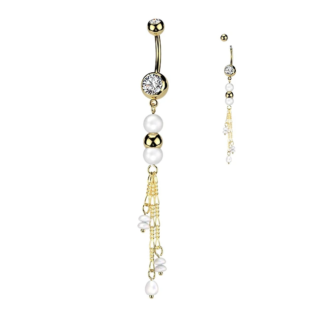 316L Surgical Steel White Pearl Gold Bead Dangly Belly Ring