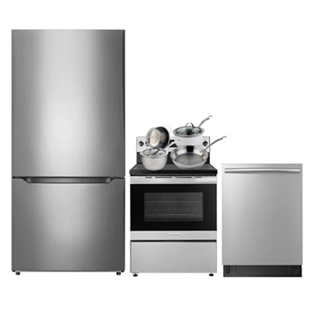 Samsung 36" 25.5 Cu Ft French Door Refrigerator; Electric Range; Dishwasher; Cookware Set - Stainless Steel