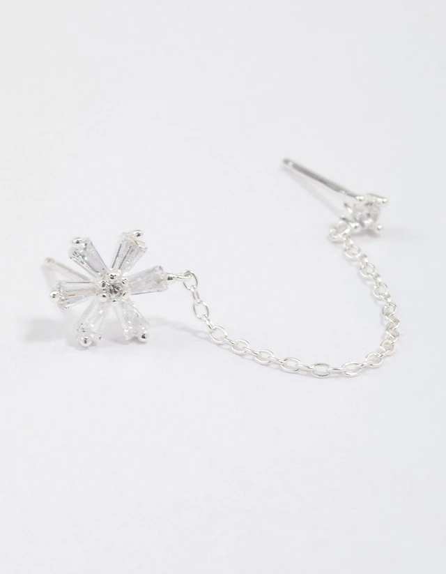 Sterling Silver Baguette Flower Chain Stud Earrings