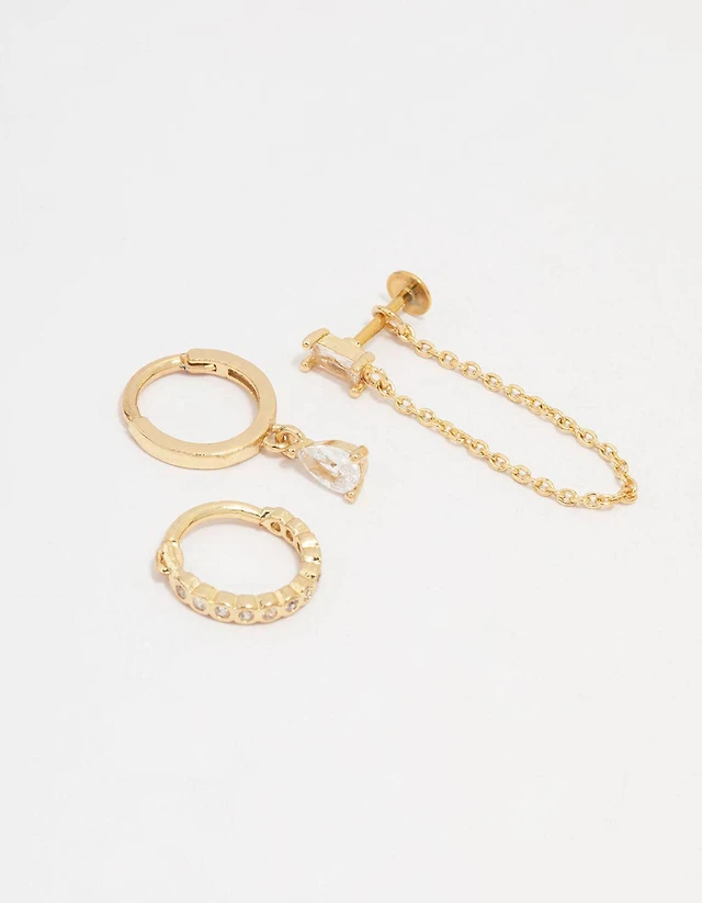 Gold Plated Baguette Huggie & Chain Earrings 4-Pack