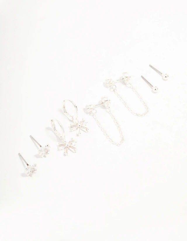Silver Plated Bow Cubic Zirconia Chain & Stud Earrings 4-Pack
