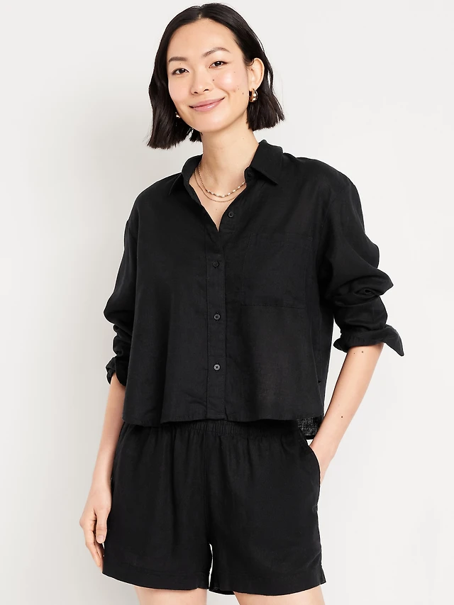 Linen-Blend Button-Down Crop Shirt