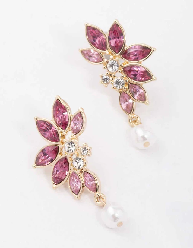 Gold & Pink Diamante Marquise Pearl Stud Earrings