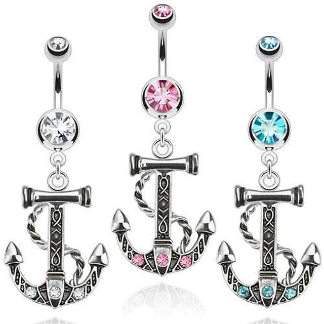 316L Surgical Steel Belly Button Navel Ring with Antique Dangling Vintage Gem Anchor