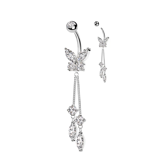 316L Surgical Steel White CZ Butterfly With Long Chain Marquise CZ Dangle Belly Ring