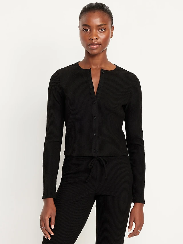 Flare-Sleeve Crew-Neck Ribbed Cardigan