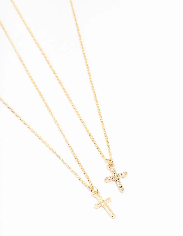 Gold Plain & Diamante Cross Necklace 2-Pack