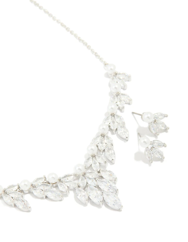 Silver Cubic Zirconia Flower Y-Necklace & Earrings Set