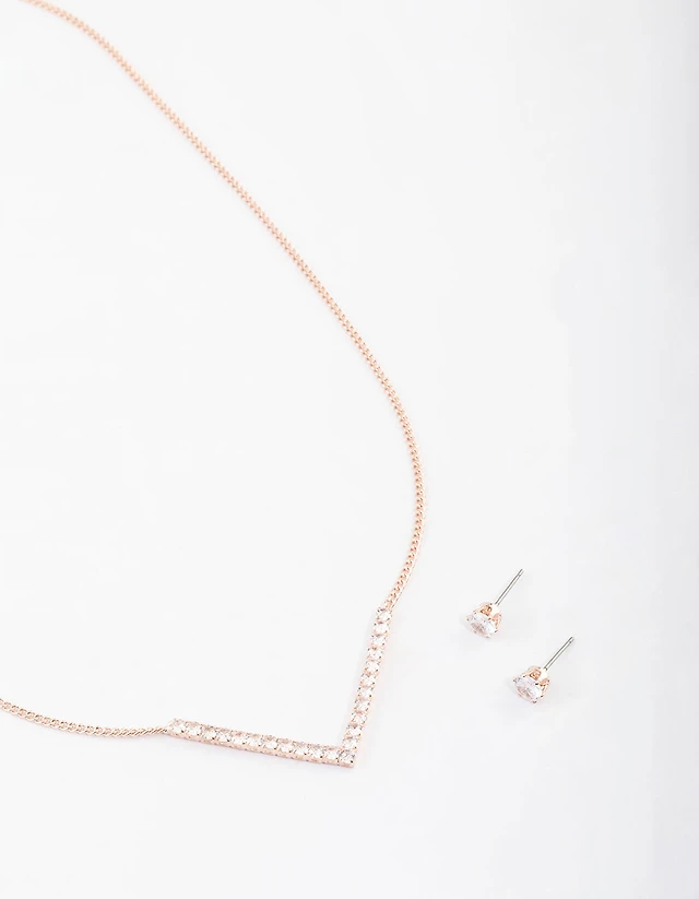 Rose Gold Cubic Zirconia V Necklace & Stud Earrings Set