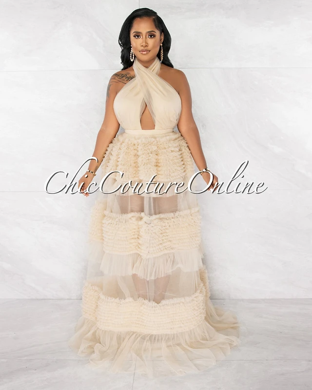 *Pleasant Nude Halter Tulle Ruffle Maxi Dress