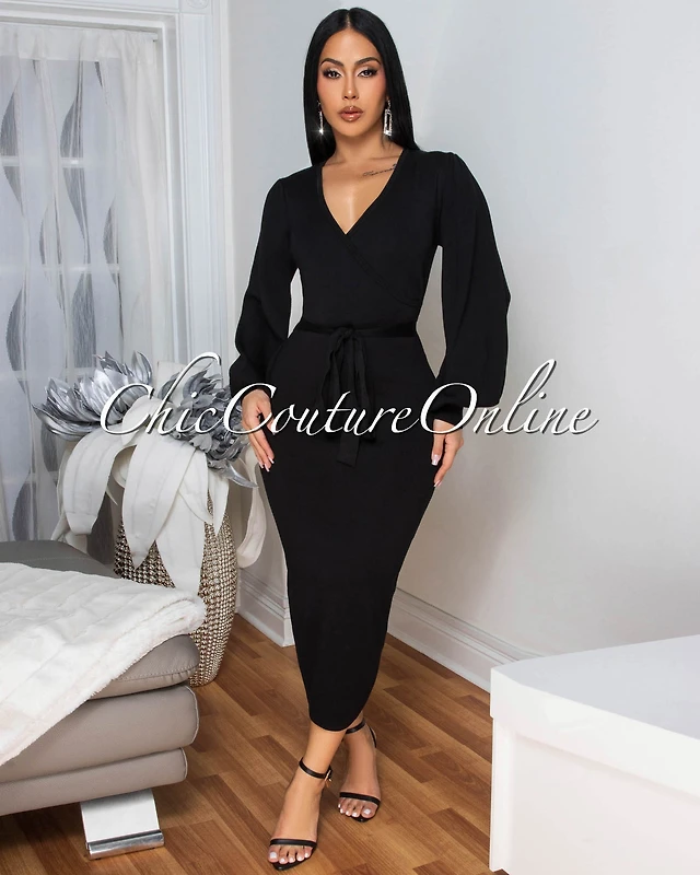*Suyen Black Satin Drape Corset Midi Dress