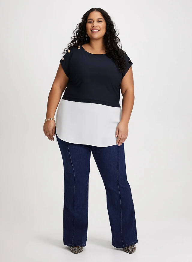 Decorative Buttons Colour Block Blouse & Pull-On Bootcut Jeans