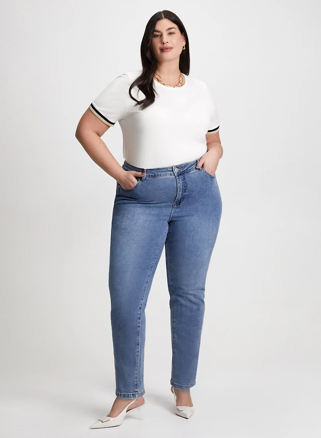 Open Stitch Sweater & Straight-Leg Denim With Trim