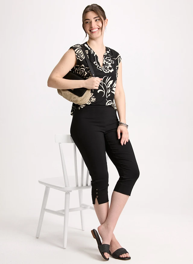 Split Neck Floral Top & Pull-On Bengaline Capris