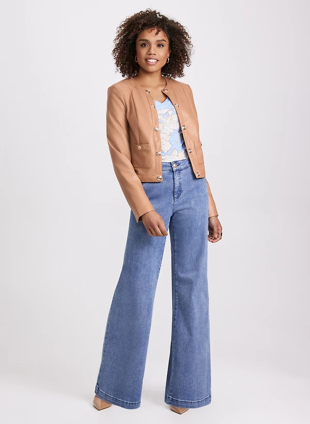 Vegan Leather Trim Blazer & Wide-Leg Jeans